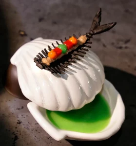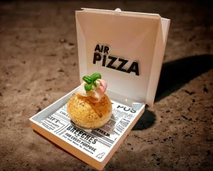 Pero donde tal vez producto, técnica y concepto más se dan la mano es en air pizza, un bocado que explota en la boca y en la cabeza. Franchesko trabajó una temporada en Italia y allí le llegó la inspiración para poner al día este clásico del fast food. Se trata de un panipuri, el pan indio frito, suflado y tostado con soplete. Lo rellena de salsa de tomate clásica y de una stracciatella de burrata con crema de queso parmesano de 24 meses de curación. Se corona con una loncha de porchetta y una hoja de albahaca. Es como probar el aire de una masa de pizza.